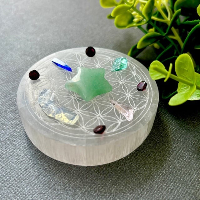 お手持ちの小さなクリスタルでご自身のお好きなグリッドを創ったり、セレナイトの上にクリスタルたちを置いて浄化にも使えます♪