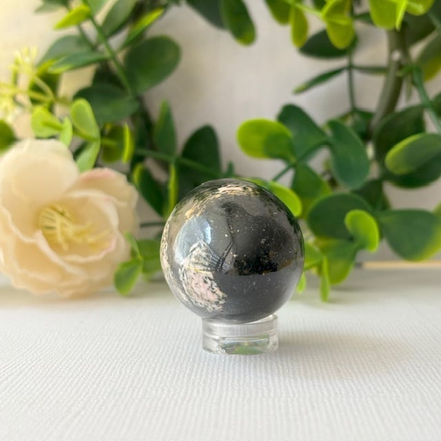 ピンクの模様がお花のようなかわいさの中にもかっこよさもある黒×ピンクのエッグ型