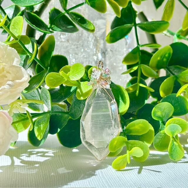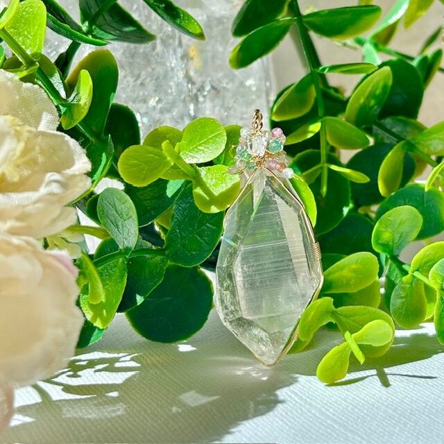 華やかにハーキマーやストロベリークォーツなどのキラキラ水晶たちも使って豊かさと美しさあふれる子に仕上がっております。