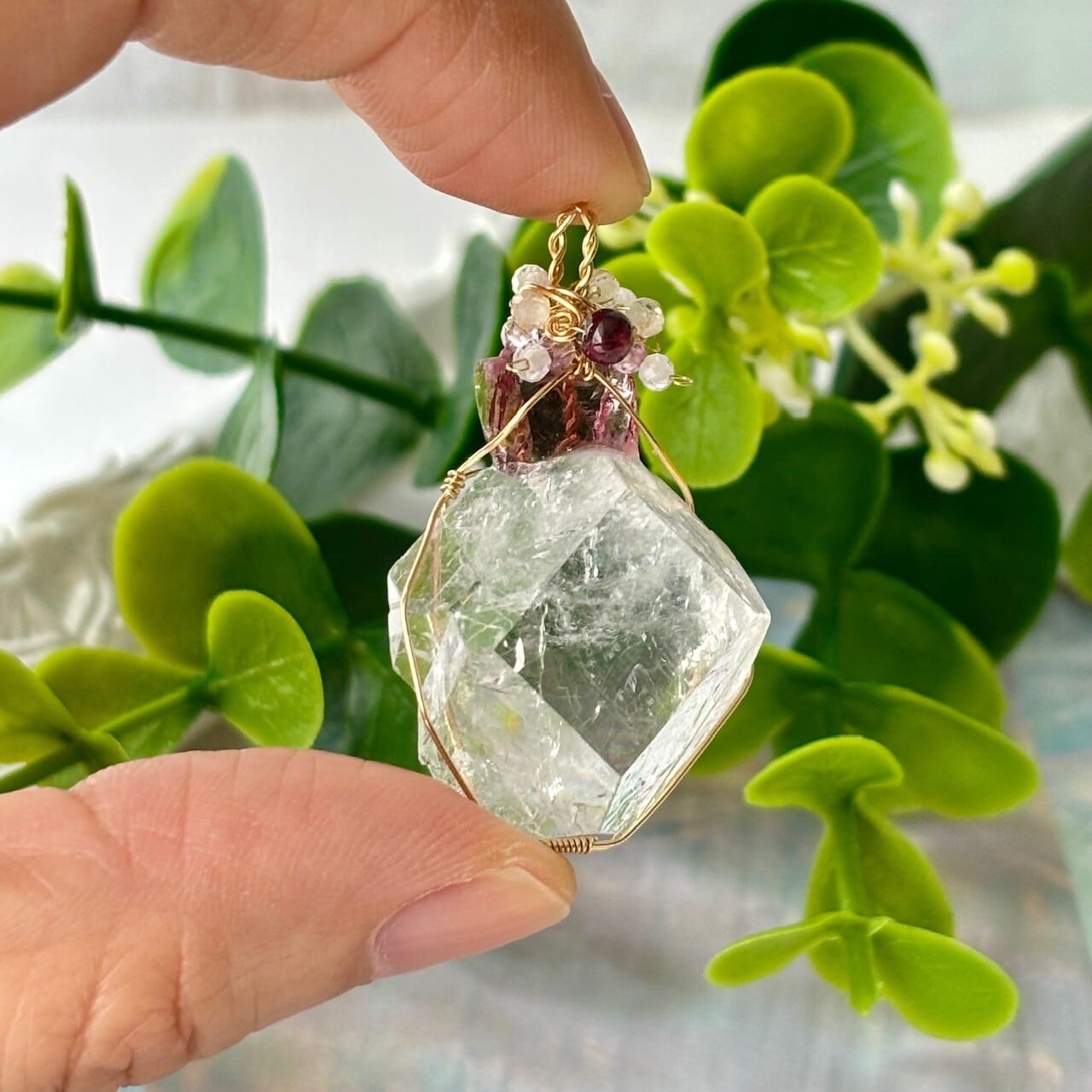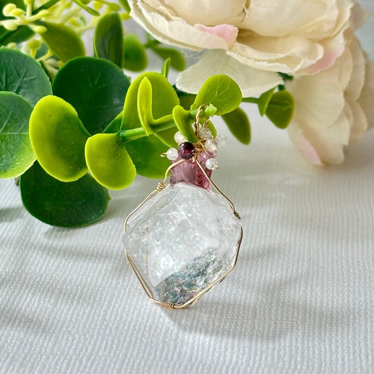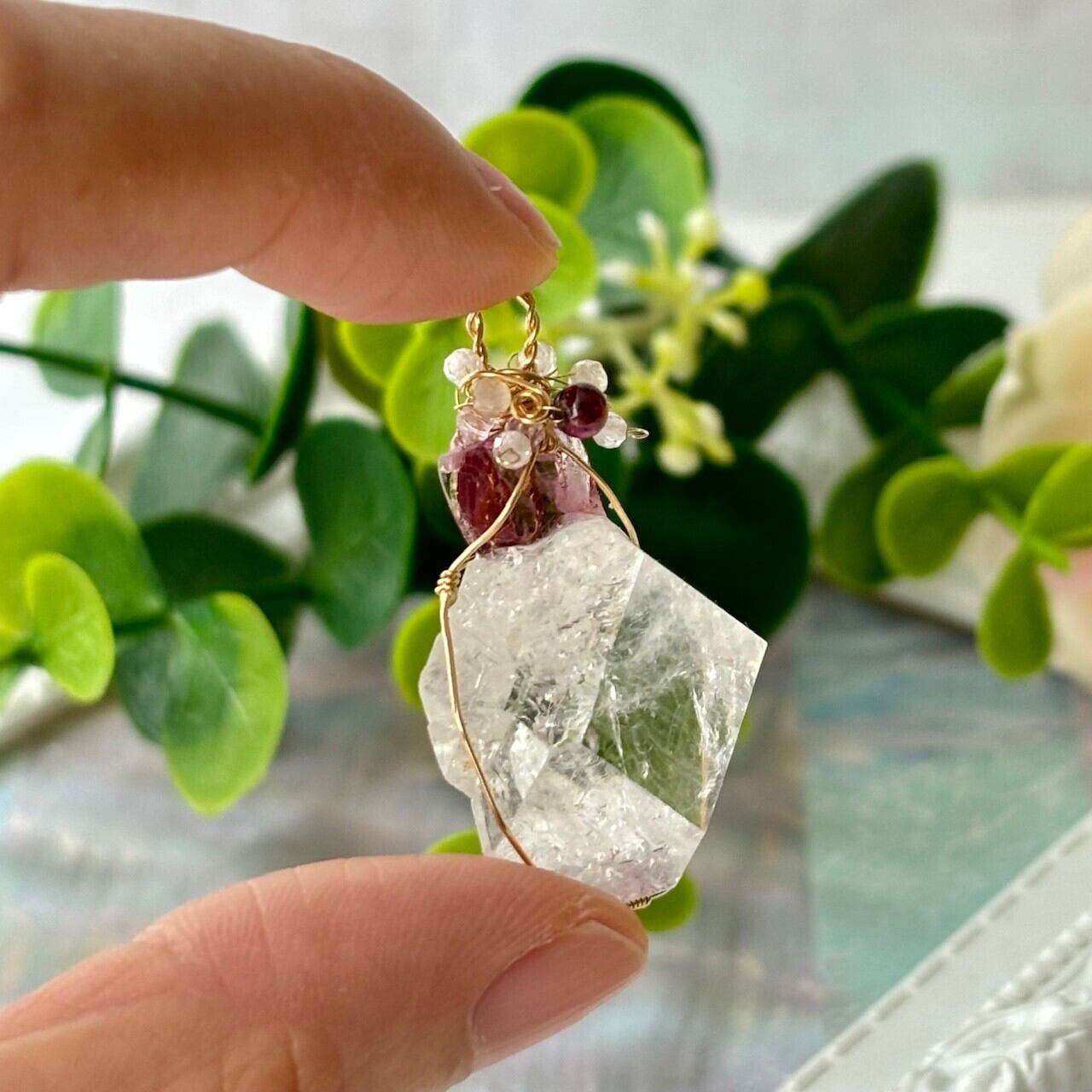使用ビーズ:ガーネット、水晶、ストロベリークォーツなど