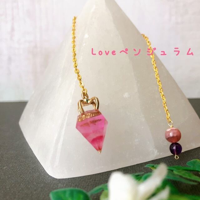 恋愛の石インカローズに最高のパートナーを引き寄せるアメジストを使用し、ペンジュラムの部分にはアンダラクリスタルとローズクォーツを使用しています。