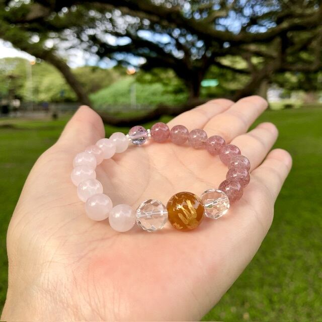 ローズクォーツとストロベリークォーツは8石ずつ使い、無限∞の愛のエネルギーを象徴させました。